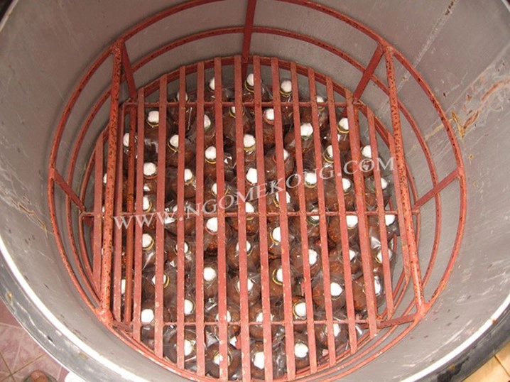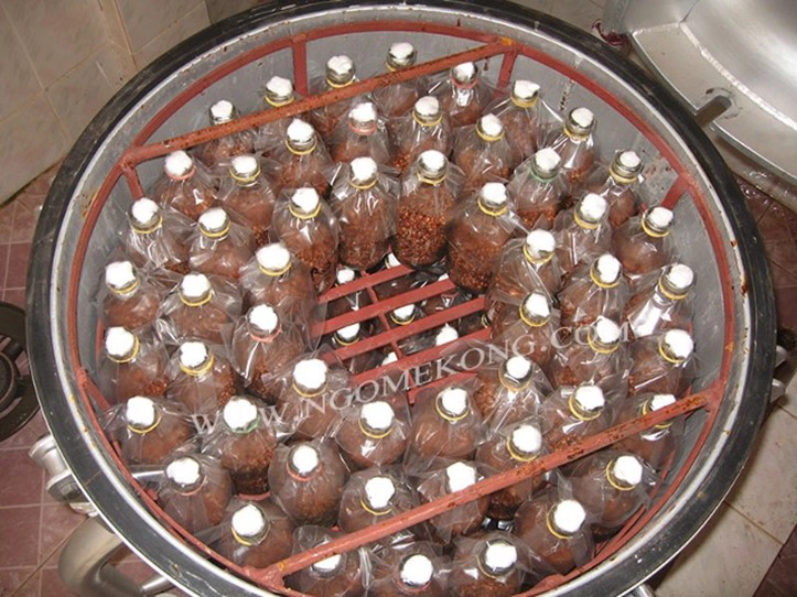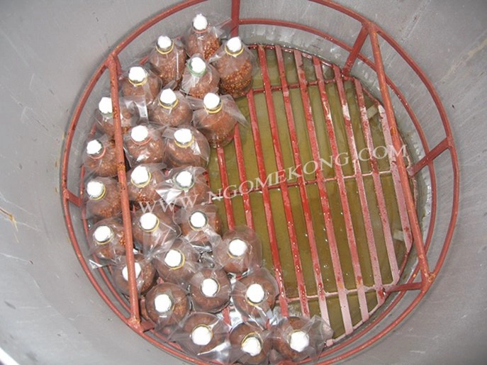 Les bouteilles remplies de graines de millet sont stérilisées à l’aide d’un autoclave que nous avons importé de Thaïlande. La stérilisation assure que toutes les bactéries et les champignons contaminants sont éliminés, créant un environnement stérile pour l’inoculation du mycélium.
