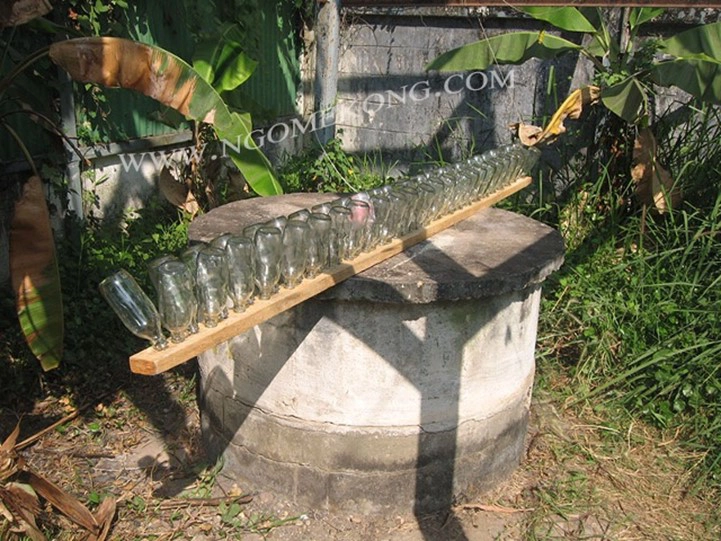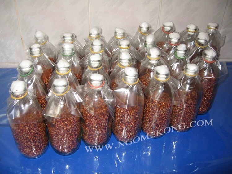 Les graines de millet préparées sont ensuite placées dans des bouteilles en verre. Les bouteilles offrent un environnement contrôlé et facilement stérilisable pour la croissance du mycélium.