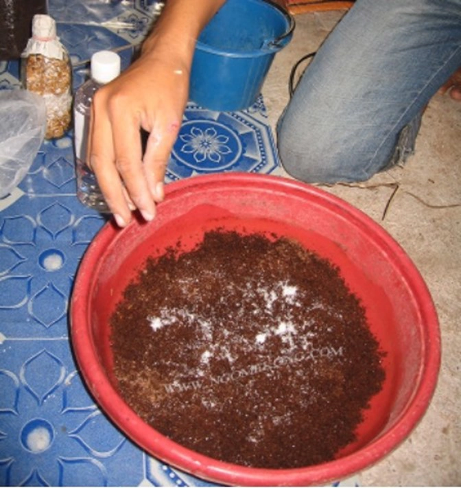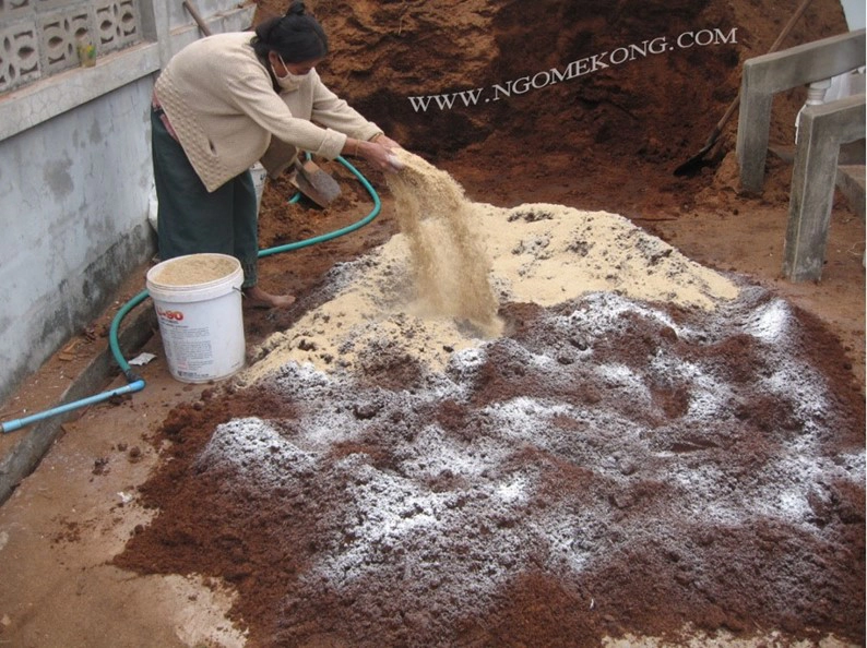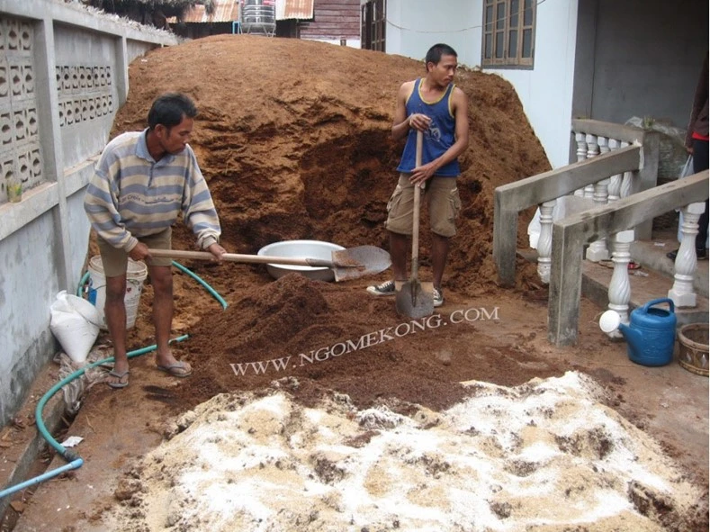 Les ingrédients sont mélangés jusqu’à obtenir une consistance homogène. L’humidité est vérifiée en prenant une poignée de compost et en la pressant. Si quelques gouttes d’eau s’échappent, l’humidité est correcte.