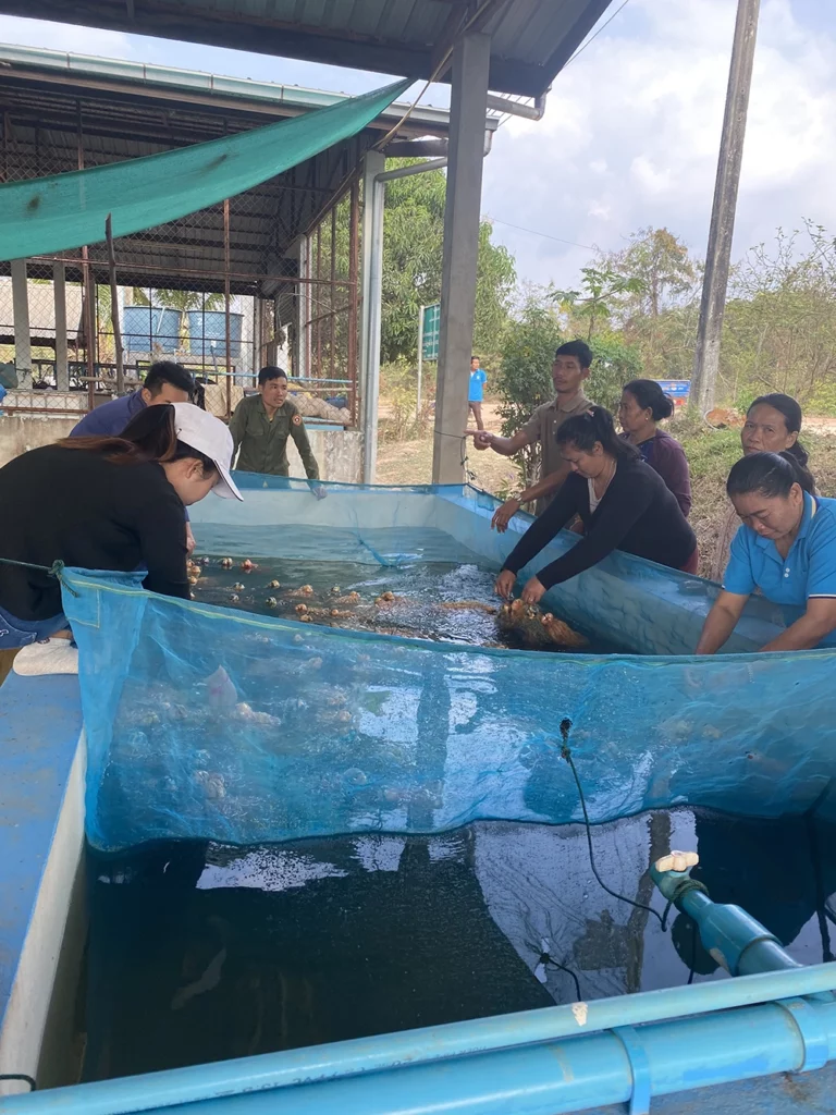 L’écloserie se concentre sur la reproduction d’espèces de poissons indigènes du Mékong, dont certaines sont classées comme en danger ou vulnérables par l’Union Internationale pour la Conservation de la Nature (IUCN)*. En plus de fournir des alevins pour l’empoissonnement des rizières, ce projet soutient la restauration des zones de frayères et des routes de migration du fleuve Mékong, renforçant ainsi les efforts de conservation de la biodiversité aquatique.